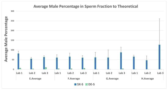 The average percentage of male DNA in the sperm fraction relative to the theoretical amount placed on the swabs is shown in Figure 4. The SX recovered more male DNA distributed into the sperm fraction than did the DE. The difference between values (displayed as -fold higher differences) are shown in Table 2.