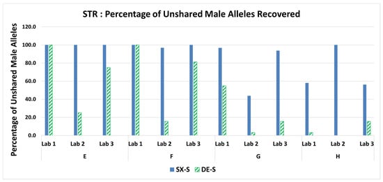 STR profiles from one of the three replicates (i.e., the sperm fraction that exhibited the lowest S/Y ratio) for each mixture were typed by LAB 1 using PowerPlex® Fusion on an Applied Biosystems 3130 Genetic Analyzer and typed by the LAB 2 and LAB 3 using GlobalFiler™ on an Applied Biosystems 3500 Genetic Analyzer. The female: male mixture genotypes contained 31 and 32 unshared male alleles for Fusion and GlobalFiler, respectively. Recovery of the unshared male alleles is shown as a percentage in Figure 6. The SX demonstrated comparable or more unshared male alleles recovered in the sperm fraction STR profiles for all mixtures run for each of the three laboratories. The percentage of unshared male alleles detected in the sperm fractions and fold differences (SX/DE) are in Supplemental Table S7. LAB 2 detected only one unshared allele (3.1%) in mixtures B and G, demonstrating higher fold differences of 32-fold and 14-fold, respectively. This may indicate there was some loss of the sperm pellet and the resulting lower recovery of male DNA. This is not uncommon in actual casework analysis by various crime laboratories with the DE method. Mixtures G and H, with the lowest amount of sperm deposited on the swabs, resulted in SX detecting more unshared male alleles as shown in Table 3. Hence, the SX renders more genetic profile information from the probative male donor than does the DE.