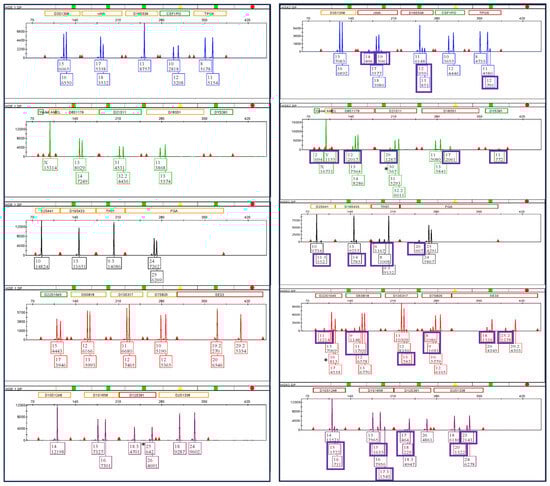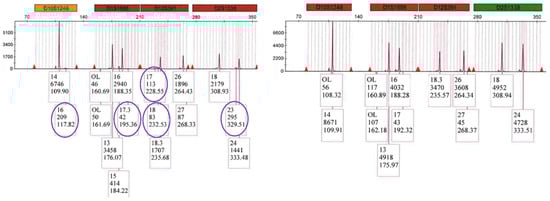 Mixture H GlobalFiler™ profiles (LAB 2) for DE female only on the left side and SX full minor unshared male allele profile on the right side. Each box contains the allele number and the associated relative fluorescence units (RFU). The unshared male alleles are shown in purple boxes.