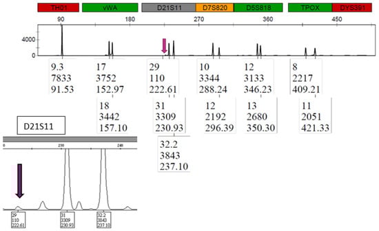 Mixture H PowerPlex® Fusion profile (LAB 1) for DE. The single unshared male 29 allele is shown by the arrow for locus D21S11.
