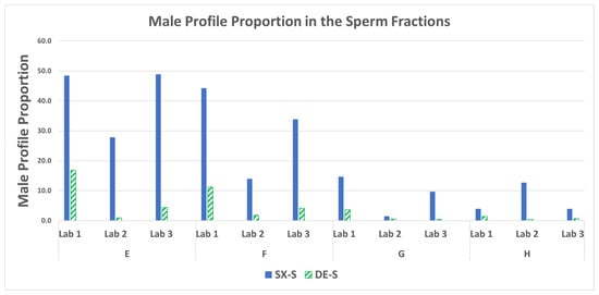 The most disparate mixture H, with a female: male ratio of 18,182:1, containing only 25 sperm cells resulted in a minor male profile with all unshared alleles detected with the SX and a single source female profile (i.e., no male unshared alleles detected) with the DE as shown in Figure 7 when processed by LAB 2. Note that LAB 2 had an unexplained inconsistency with more alleles obtained in mixture H than in mixture G. LAB 2 did recover more sperm DNA in mixture G than in mixture H (Figure 2). This can potentially be due to inhomogeneities in sample preparation due to stochastic effects with lower amounts of DNA or loss of sperm DNA in mixture G during processing.
