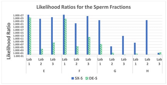 Likelihood ratios for the male profile probabilities in the sperm fractions for mixtures E–H.