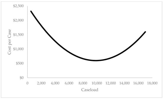 A more detailed depiction of the average cost of processing a case is illustrated for DNA casework in Figure 1. Notice that the minimum cost (perfect economies of scale) is associated with a caseload just under 10,000 cases processed per year. The reduction in average cost up to that point is largely the result of productivity increases as highlighted in Figure 2, which shows the average number of cases processed per full-time equivalent employee (FTE).