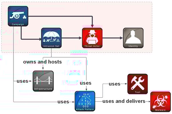 “Threat actors” refer to individuals, groups, or organizations which operate in cyberspace with a malicious intent. We, however, chose to build our recommender model to predict “intrusion sets” (which can subsequently be mapped to threat actors and then to identities, e.g., by LEAs) in order to provide greater flexibility. Cyberattacks are often leveraged by threat actors as part of a coordinated campaign against a specific target to achieve a specific objective. An entire attack package consisting of multiple campaigns sharing properties and behaviors and believed to be orchestrated by a single threat actor is represented in STIX 2 as an “intrusion set”, and there are advantages in reasoning about attribution in terms of intrusion sets. For example, the threat actor behind a given attack may not be known, but their multiple operations can be grouped together in an intrusion set, and then a new attack can be attributed—technically, without involving identities—to that intrusion set. This form of attribution almost always helps when responding to the attack and mitigating its impact, and it can also be a useful step in discovering the attackers’ identities. We note that a threat actor can move from one intrusion set to another, changing their TTPs, or they can “utilize” multiple intrusion sets at the same time. The attribution relationships in STIX 2 are shown in