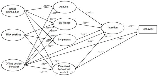 The results of the fit statistics of the subsequent model indicate an adequate model fit: chi square (548) = 3740.55, p < 0.001, CFI = 0.96, TLI = 0.96, RMSEA = 0.040 (C.I. 90%: 0.039–0.041), SRMR = 0.080. The authors’ analyses reveal that attitude, subjective norms (friends and parents), perceived behavioural control, disinhibition, offline deviant behaviour, and risk-seeking, together with the covariates gender and age, account for 38.8% of the variance in hacking intention, and when combined with intention, explain 33.6% of the variance in young people’s engagement in hacking. The results of the structural model are presented in Figure 1.