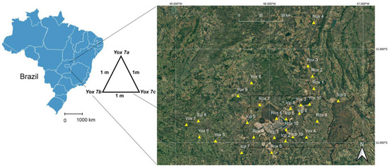 Geographical distribution of soil sampling sites within the Cerrado biome of Brazil. Inceptisol samples are labeled as Icp1–Icp10, reddish Oxisol as Rox1–Rox10, and yellowish Oxisol as Yox1–Yox10.