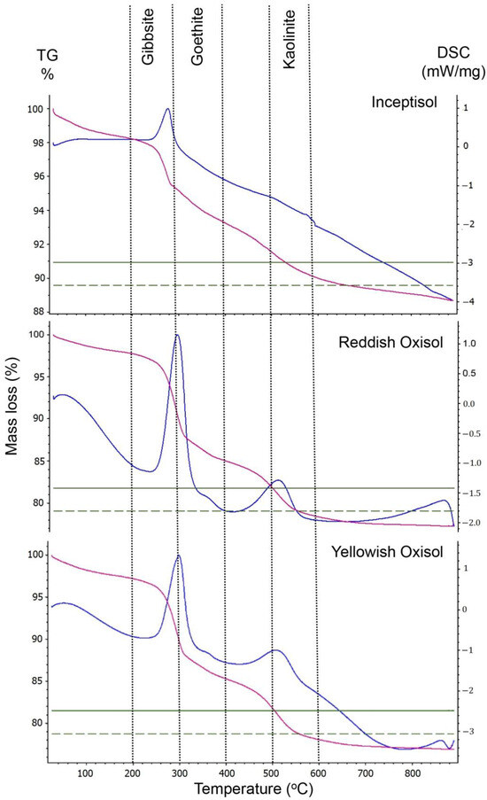 The percentages of the targeted minerals and differential scanning calorimetry (DSC) temperatures recorded during the thermal analysis (Figure 2) showed slight variation within soil sample triplicates (Table 1). Such a variation increased among triplicates, and the percentages of gibbsite (Gb) varied over ten times among Inceptisol (Icp) samples, 1.8 times among reddish Oxisol (Rox) samples, and 31 times among yellowish Oxisol (Yox) samples (Table 1). Likewise, kaolinite (Kt) and goethite (Gt) variations respectively ranged 3–5 times among Icp samples, 1.9–3.5 among Rox samples, and 9–15 times among Yox samples (Table 1). The Rox presented higher percentages of Gb and Gt than Icp and Yox, but Kt concentrations leveled between the two Oxisol soils (Rox and Yox) and remained higher than in Icp soil (Table 1; Figure S1).