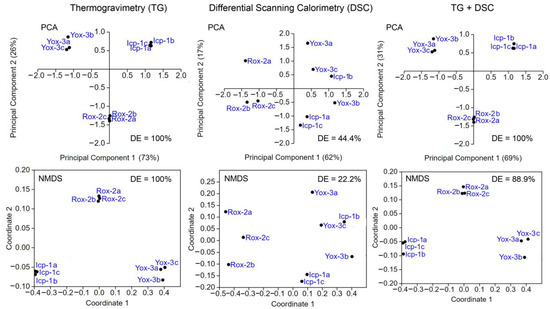 Principal component analysis (PCA) and nonmetric multidimensional scale (NMDS) of thermogravimetry (TG) and differential scanning calorimetry (DSC) data for Inceptisol (Icp), reddish Oxisol (Rox), and yellowish Oxisol (Yox) samples. DE—discrimination efficiency.