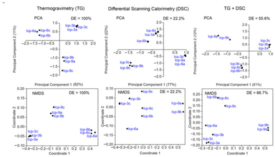 Principal component analysis (PCA) and nonmetric multidimensional scale (NMDS) of thermogravimetry (TG) and differential scanning calorimetry (DSC) data for Inceptisol (Icp) samples. DE—discrimination efficiency.