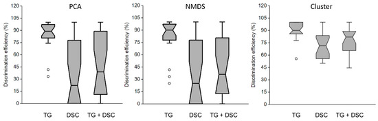 Boxplot analysis (Figure 5) of one hundred DE results from multivariate tests highlighted that TG analysis of soil samples consistently achieved higher and less dispersive DE values when subjected to PCA, NMDS, and cluster analysis. In contrast, the DE values for DSC and TG + DSC data exhibited inconsistencies. Cluster analysis demonstrated superior DE values and more consistent behavior than PCA and NMDS analysis for the same data.