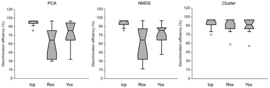 A slight advantage was observed in adopting PCA for discriminating between Icp samples compared to NMDS and cluster analysis. Cluster analysis of TG data more effectively discriminated Rox and Yox samples than PCA and NMDS (Figure 7).