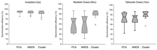 The role of soil type in discrimination efficiency was evident, with Icp samples showing better discrimination efficiency from each other than Rox and Yox samples when TG data underwent PCA and NMDS. Cluster analysis narrowed the DE gap among the three soil classes, although the DE among Icp samples remained less dispersive than among Rox and Yox samples (Figure 6).