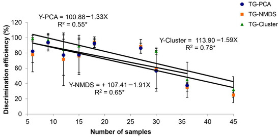 Regression of discrimination efficiency (%) on the number of soil samples used in multivariate analyses: principal component analysis (PCA), nonmetric multidimensional scale (NMDS), and cluster analysis (K-means). * p ≤ 0.05.