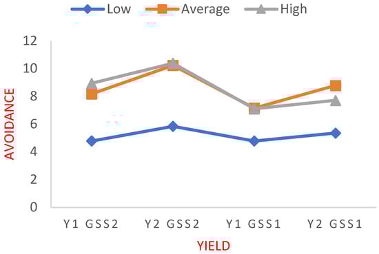 • Low (−1 SD from the mean), medium (mean value) and high ( + 1 SD from the mean). A GLM for repeated measures model was generated, assuming the yield dimension on four levels (Yield1GSS2, Yield2GSS2, Yield1GSS1 and Yield2GSS1) as the dependent variable, and Avoidance_level as the fixed factor.