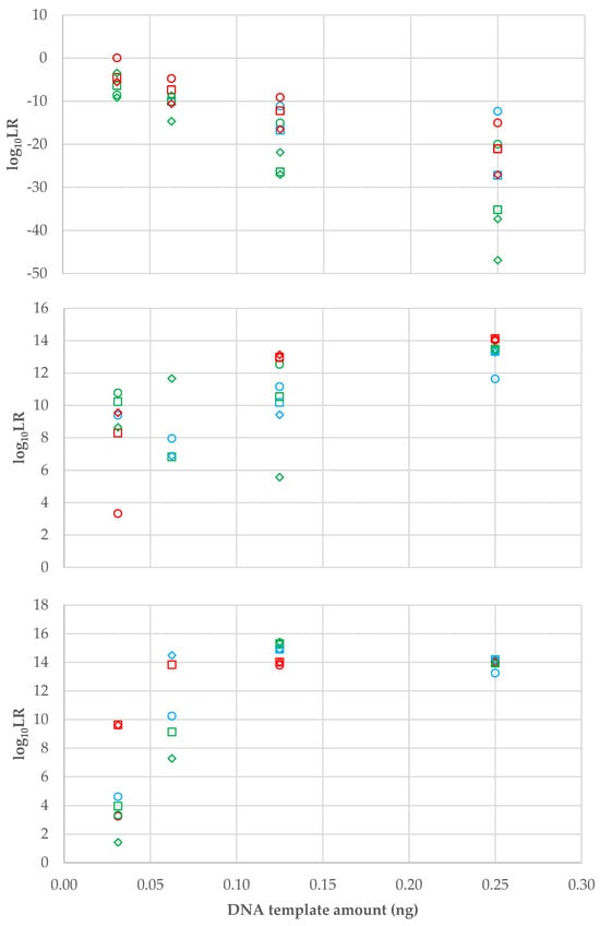Figure 1. LRs calculated for proposition pairs 1 (top), 2 (middle), and 3 (bottom). STR profiling assays are Identifiler™ Plus, GlobalFiler™ and Fusion 6C. CE injection times are 5 s (), 10–15 s (□) and 20–25 s (◊).