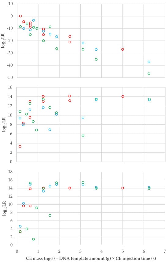 The LRs calculated for the three proposition pairs are plotted in Figure 1 as functions of the DNA template input amounts. The log10LR generally decreased below zero with increasing template amount for proposition pair 1 (false propositions) and generally increased above zero with template amount for proposition pairs 2 and 3 (true propositions). There is evidence of a plateau for proposition pair 3 at log10LR ≈ 14. For proposition pair 1 at a given template amount, log10LR is generally lower for longer CE injection times. This is because a longer injection time results in more DNA being delivered to the capillary, resulting in a stronger signal. We define a quantity we call CE mass (ng∙s), which is the product of the DNA template amount (ng) and the CE injection time (s) and is indicative of the amount of DNA delivered to the capillary which, in turn, should be indicative of the amount of information available for determining likelihoods. The LRs calculated for the three proposition pairs are plotted in Figure 2 as functions of the CE mass.