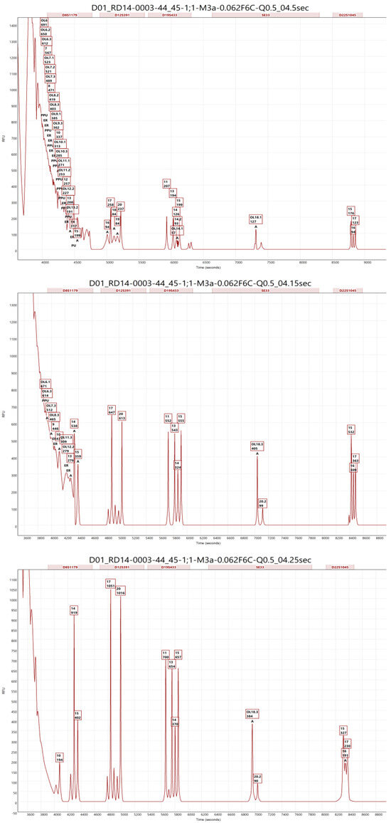 Figure 3. Electropherograms (CXR dye) for the three CE injections of 0.0625 ng DNA template amounts amplified by PowerPlex® Fusion 6C System. CE injection times are 5 s (top), 15 s (middle), and 25 s (bottom). D8S1179 is the first locus at the left in all three epgs.