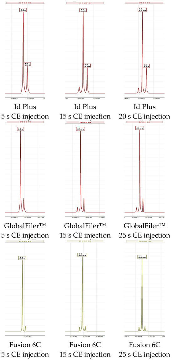 The 36 epgs were imported into the Open Source Independent Review and Interpretation System (OSIRIS, Version 2.16, https://www.ncbi.nlm.nih.gov/osiris/) [15] as part of their plate folders, together with plate-specific ladders. Default analysis settings were applied except for minimum RFU, which were 50 for analysis and detection and 150 for the ladder and the internal lane standards (ILS). Three ILS were employed—ABI-LIZ-600-80 to 400 for Identifiler™ Plus, ABI-LIZ-600-60 to 460 for GlobalFiler™, and Promega-ILS-WEN-500 for Fusion 6C (Supplementary Table S1). Example electropherograms for 0.25 ng DNA template amounts and 5 s CE injection times for Identifiler™ Plus, GlobalFiler™, and Fusion 6C are shown in Supplementary Figures S1, S2 and S3, respectively. Tab-delimited analysis data were exported from OSIRIS and saved as Excel spreadsheets.