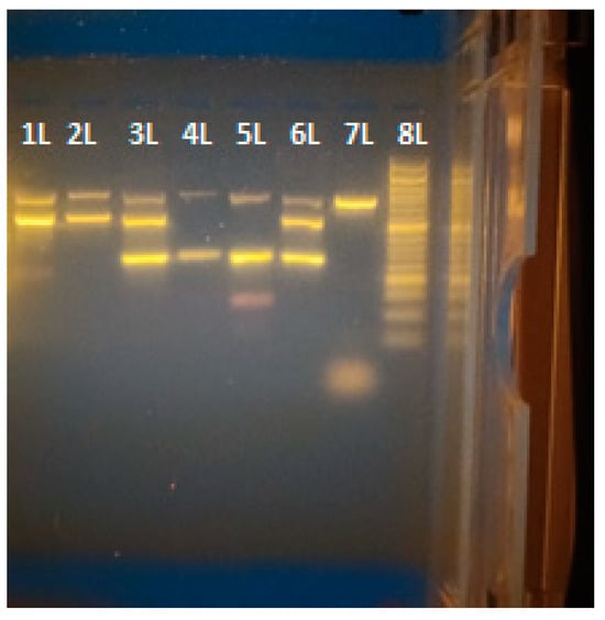 The samples were consequently visualized using electrophoresis (1% gel, 30 µL 1×TBE buffer, 0.3 g agaroses, 3 µL of dsGreen Nucleic Acid Gel Staining Solution (Lumiprobe Life science solutions, Hannover, Germany)). A total of 5 µL of the post-PCR sample mixed with 1 µL of Orange DNA Loading Dye (6×) (Thermo Fisher Scientific) was loaded into each well. The gel electrophoresis was run for 45 min at 65 V.