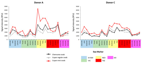 We first investigated whether the size and shape of the swab head, using similar flocked swab technology, had any effect on the result, starting with an initial blood deposit of 10 µL. We repeated the analyses in duplicate using samples from donors A and C, as these samples are the closest in terms of DNA concentration. Statistical analysis performed with the ANOVA tests showed no significant differences among swabs tested (p-value = 0.01); complete profiles were obtained with the same intensity across all tests (Figure 1).