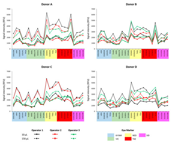 Signal intensity across all amplified markers for each blood donor sample. Charts show average RFUs for each operator and each initial volume deposited on the Copan regular flocked swab. Statistical analysis shows no significant difference among operators.