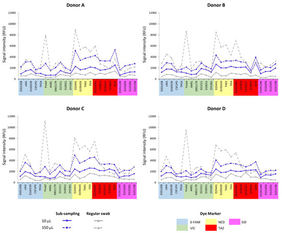 Average signal intensity across all amplified markers for each blood donor sample. For each volume of blood initially deposited (10 μL or 150 μL), all subsampling results across operators were averaged. One single Copan regular flocked swab with 10 µL or 150 µL of blood was also analyzed as a control. All swabs were tested on a unique RapidHIT ID® instrument. Charts show average RFUs for each initial volume deposited on the Copan regular flocked swab. Statistical analysis shows a significant difference among the profile intensities observed between the subsampling tests of 10 µL and 150 µL of blood.
