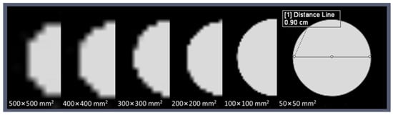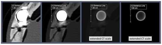 In addition to the windowing in a high HU range, the spatial resolution of the reconstructed CT image also has a considerable influence on the representation of the bullet and thus on the accuracy of shape determinations and caliber measurements. For an accurate spatial representation of the bullet, the reconstruction field of view (FOV) must be considered, as it influences the in-plane voxel size [14]. Users can define the in-plane voxel size according to the size of the reconstructing FOV within the available matrix, which is usually a 512 × 512 matrix. By selecting a smaller reconstruction FOV aligned with the size of the lodged bullet, the resolution of the bullet’s display can be significantly enhanced, allowing for greater detail in its visualization (Figure 2).