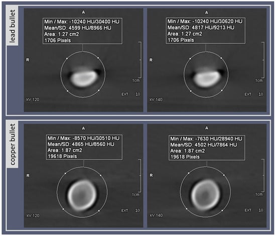 For material-based differentiation, either automated segmentation tools or manual region-of-interest ROI measurements are applied to provide HU values at the same position within the bullet on CT scans acquired at both lower and higher energies [25]. By calculating the DEI, the influence of factors such as beam hardening is minimized, enabling reliable differentiation between materials, such as lead and copper [22,26]. Studies have shown that photon energies obtained from tube voltages of 120 kV and 140 kV are most effective for distinguishing between copper and lead bullets using the dual-energy index [22,26]. Despite being called the ‘dual-energy index’, its use for projectile differentiation does not necessarily require a dual-energy CT scanner. In fact, dual-energy CT datasets typically cannot be reconstructed with the extended CT scale. To differentiate metals using the dual-energy index, two single-energy scans can be performed: one at 120 kV and another at 140 kV, specifically targeting the region containing the metallic foreign body. When performing ROI measurements, it is important to ensure that the reconstructions from both CT scans use the same reconstruction kernel, in-plane FOV, slice thickness, and slice increment to maintain consistency (Figure 4).