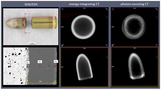 A 9 mm lead projectile (PP41) with a steel jacket (and copper plating). The thickness of the casing (350 µm) was visualized using scanning electron microscopy (SEM), and the material was identified using energy dispersive X-ray (EDX) spectroscopy. Due to beam hardening (bright outer area), conventional energy-integrating detector CT scans cannot reliably determine whether the bullet is jacketed; however, this is more easily discernible with photon-counting CT. In photon-counting CT, a weak beam hardening is visible around the outer edge (bright outer area), which can be attributed to the steel jacket, while stronger beam hardening further inward (an even brighter area) is followed by photon starvation towards the center (dark area in the center), which can be attributed to the lead.