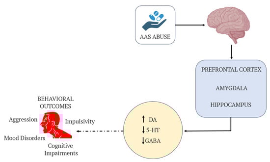 The psychological and behavioral consequences of AASs use are profound, often manifesting in increased aggression, mood disorders, and dependency-related withdrawal symptoms []. These effects can have severe personal, social, and legal ramifications, affecting users’ relationships, occupational stability, and overall quality of life. The neurobiological impact of AASs on key brain regions and neurotransmitter systems plays a crucial role in modulating emotions and behavior, contributing to significant mental health disturbances [].
