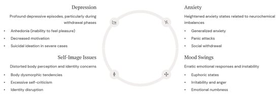 Beyond aggression, mood disorders are another serious psychological consequence of AAS use. Depression, anxiety, and severe mood swings are frequently reported among both active users and individuals experiencing withdrawal from AASs (Figure 2).