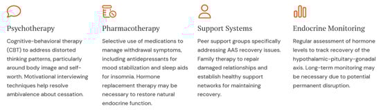 Early intervention is crucial, as prolonged AASs use can lead to more severe and potentially irreversible psychological and endocrine effects. Treatment should be tailored to individual needs, with particular attention to underlying factors that initially motivated steroid use. Psychotherapy (e.g., CBT, motivational interviewing), pharmacotherapy (for symptoms and hormone restoration), support systems (peer and family therapy), and endocrine monitoring can be used to track physiological recovery.