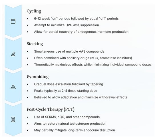 The administration protocols in non-medical settings are summarized, highlighting each characteristic: cycling (intermittent use for recovery and HPG axis mitigation), stacking (concurrent use of multiple compounds for maximal effect), pyramiding (gradual dose adjustment for adaptation and withdrawal management), and post-cycle therapy (PCT) (aimed at restoring natural hormone production post-use).