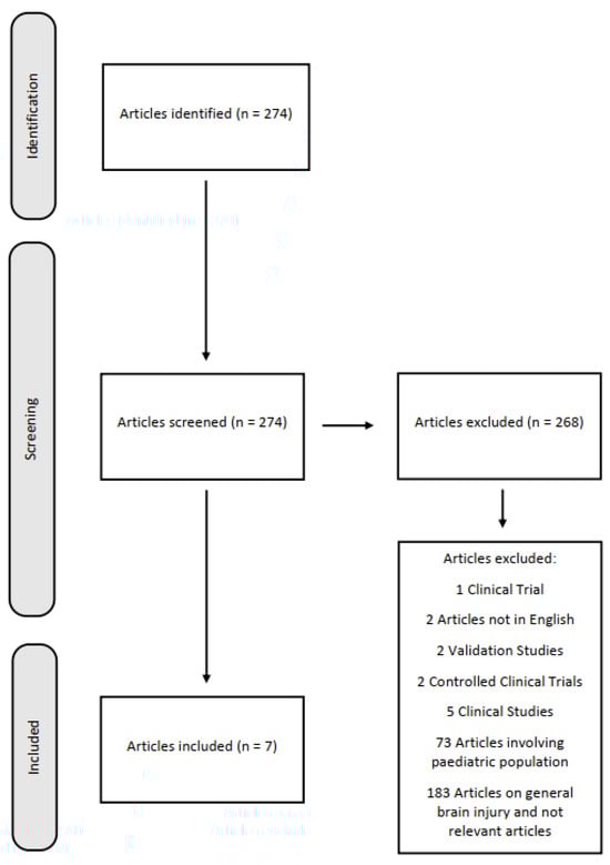 We selected articles that discuss cases where the diagnosis of CTE was achieved through post-mortem examinations. In many of these cases, the diagnosis was unexpected, as it was initially believed that the underlying neuropathology, if present, was different. Inclusion criteria were: articles describing or investigating patients with a history of professional or non-professional TBI of any severity, and written in English. Exclusion criteria were: articles written in languages other than English, articles involving pediatric populations, clinical studies, clinical trials, controlled clinical trials, validation studies, and articles on general TBI. The initial electronic data search yielded a total of 274 potentially relevant studies on PubMed and Scopus. The articles were carefully evaluated based on their title, abstracts, and texts. Implementation of these procedures resulted in only 7 eligible papers for inclusion from the initial 274 articles within the search (Figure 1). All the included studies are reported in Table 2.