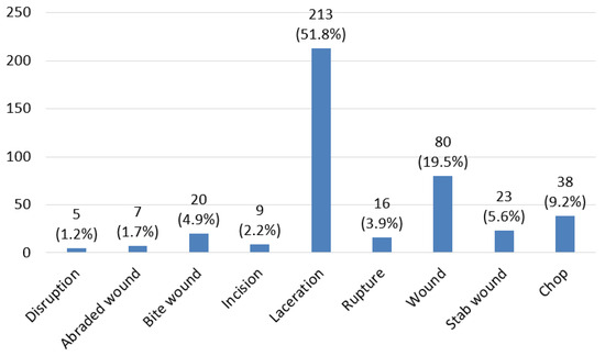 Among the 2266 soft tissue injuries, three categories were distinguished. Injuries involving disruption of skin continuity or material loss—referred to as “wounds,” such as incisions or lacerations in the injury descriptions—accounted for 411 cases, with nine injury types recorded (