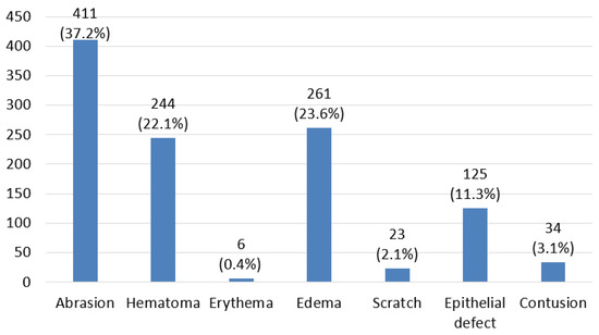 Figure 1). Injuries that did not involve disruption of skin continuity, such as hematomas, accounted for 1104 cases, with nine injury types recorded in the morphological descriptions (