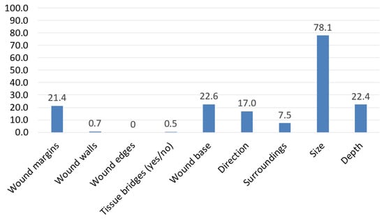The level of detail in soft tissue injury descriptions was further assessed by examining how many specific injury characteristics were recorded on average per case. For injuries involving disruption of skin continuity or material loss—referred to as “wounds”—an average of only 1.70 characteristics were documented per injury, despite the range of possible descriptors such as size, depth, margins, wound walls, edges, condition of surrounding tissue, presence of tissue bridges, wound base, and the injury’s course or direction. Notably, many of these details were frequently omitted, and certain features, such as wound edges, were not mentioned in any report (