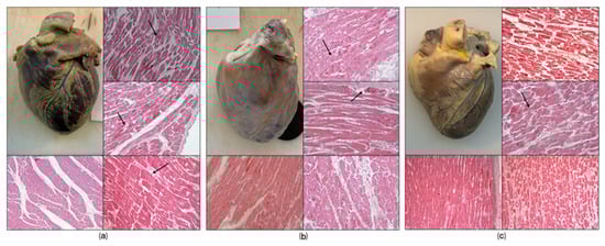 Histological findings. Macroscopic examination (a,c): revealed no significant alterations (cases a and c); (b) presents a slight pericardial opaque layer. Microscopic examination (a–c): The areas indicated by the arrows in H&E staining are foci of contraction band necrosis. (a) In the H&E pic bottom left represents an almost normal myocardial tissue; (b) the H&E photo at the bottom left shows a slight thickening of the fibrous support network, while to the right of the perivascular hemorrhages. (c) The image at the top right and the one at the bottom right show the segmentation of the myofibers at H&E staining.