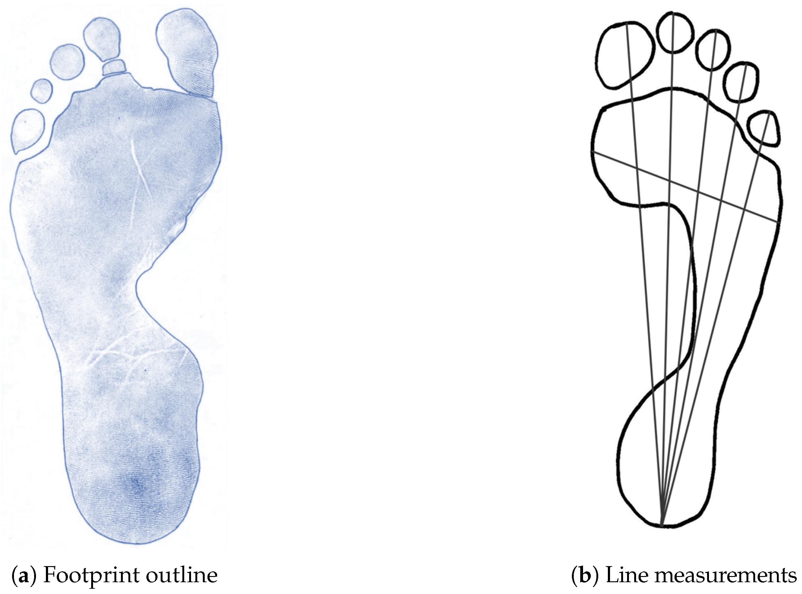 - Mukhra, R.; Krishan, K.; Kanchan, T. Bare footprint metric analysis methods for comparison and identification in forensic examinations: A review of literature. J. Forensic Leg. Med. 2018, 58, 101–112. [Google Scholar] [CrossRef]