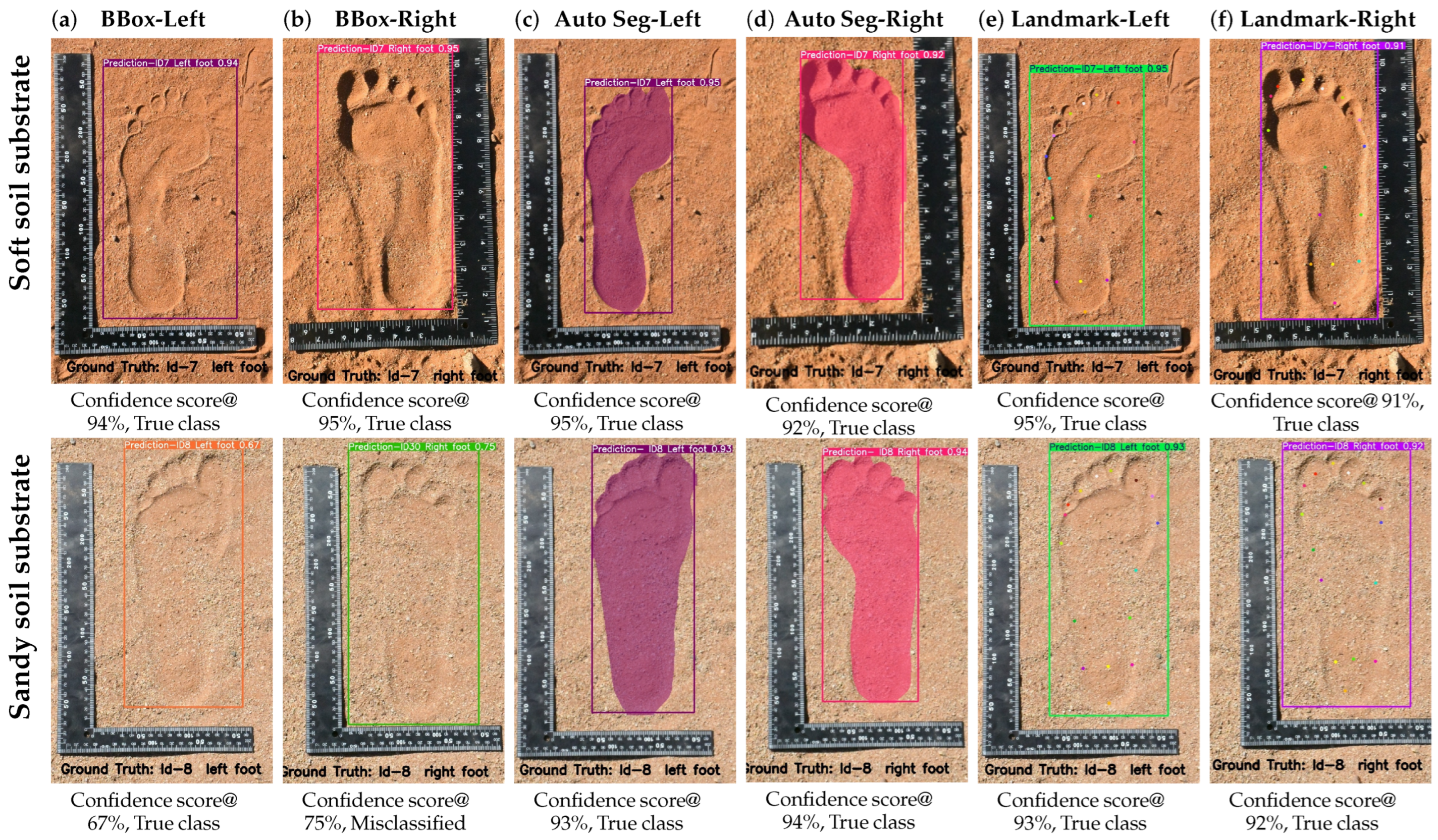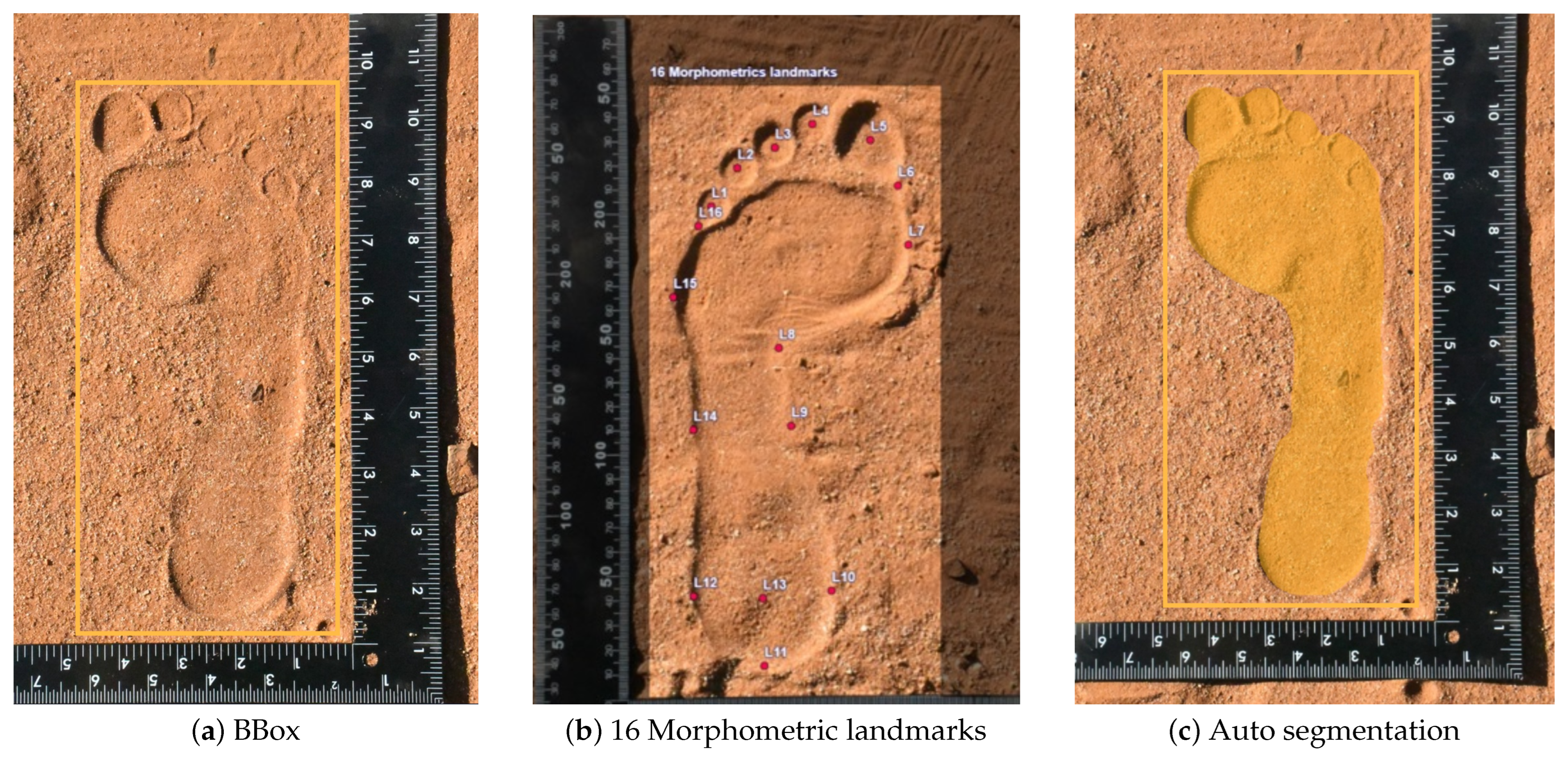 - This study is the first to investigate barefoot print classification through deep learning using a bounding box (BBox), anatomical landmarks, and automatic segmented outlines on the soil substrate.