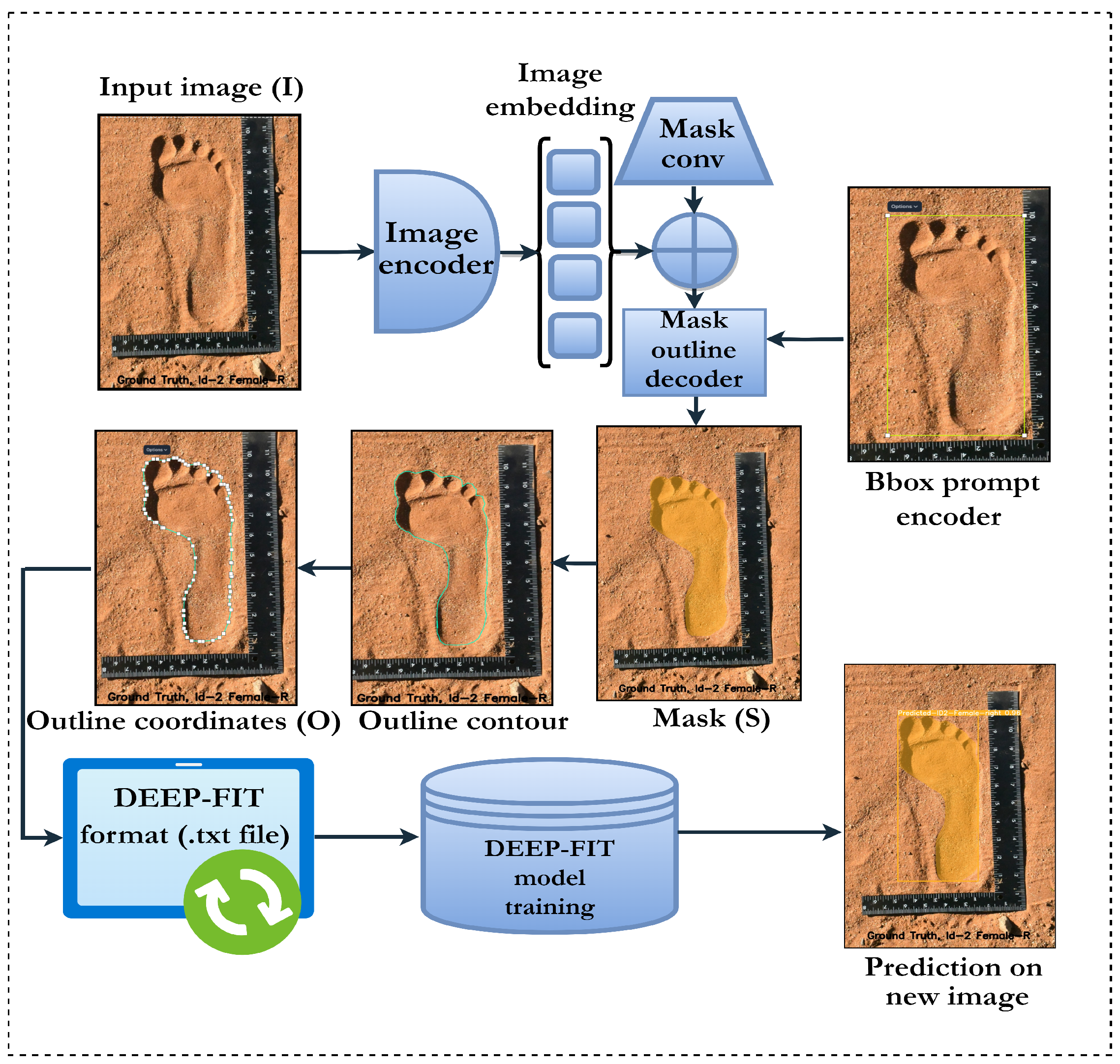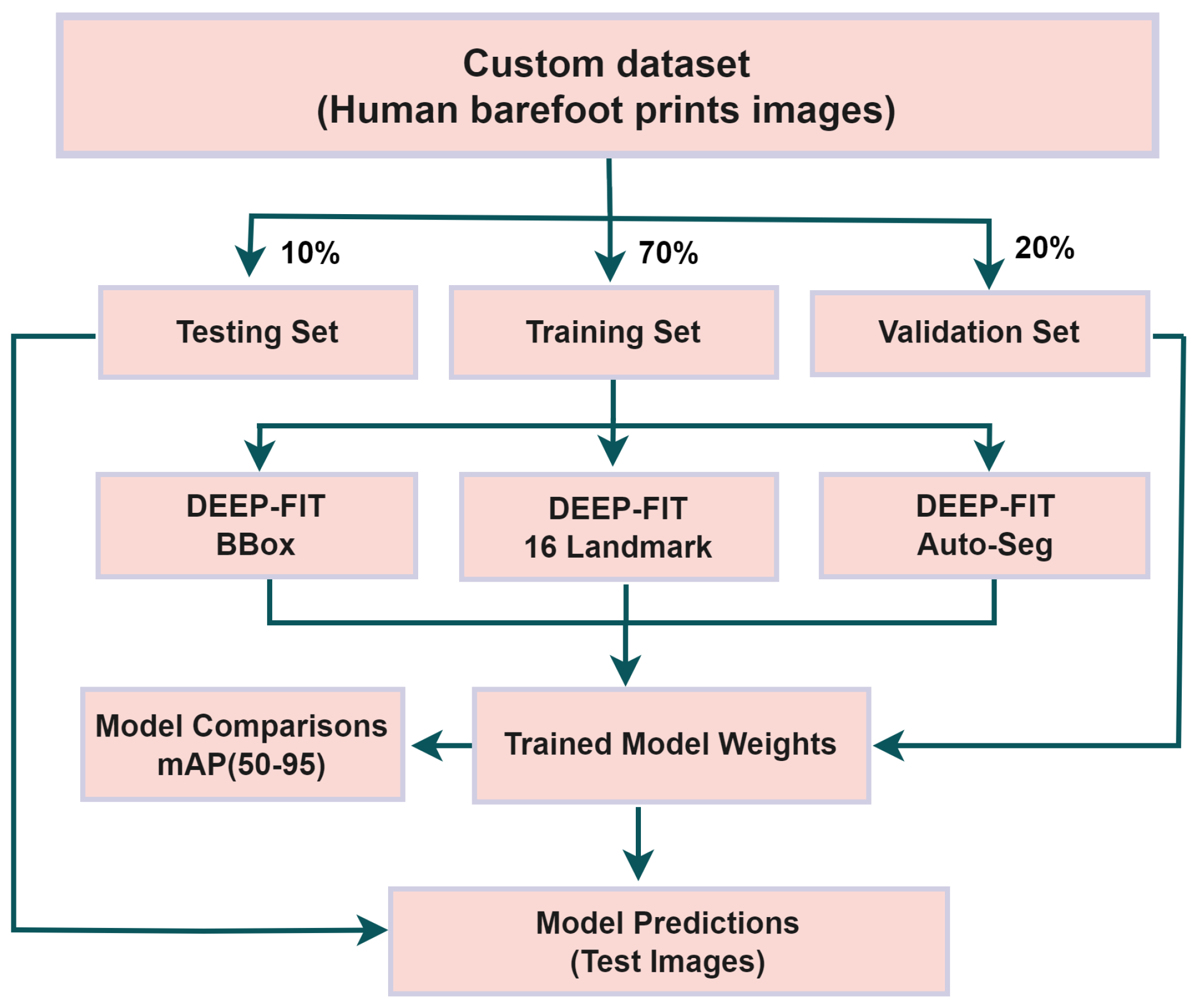 | Our study | DeepFIT auto segmentation | Soft and sandy soil substrate | Segmented outlines | 40 indiv. & 22,000 images | 90% | Barefoot print images are collected on soil substrate using a camera for identification. |