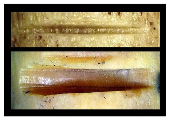 Consistent with previous studies [22,23,24], saws with alternating sets created all undulating FS (100%) and the majority of straight/undulating FS (87.1%). These studies also claim that straight FS are indicative of a wavy set; while all saws with wavy sets did create straight FS, straight FS also made up 69.7% of the alternating set cuts and 92.5% of the raker set cuts. Bernardi et al. [23] also noted that straight FS could be seen with alternating sets and suggested that this could be the result of high TPI. In our study, 43 of the straight FS were created with alternating sets and low TPIs (<10), indicating that TPI cannot explain this occurrence. All high (>19)-TPI saws did create straight FS but so did many medium- and low-TPI saws. Overall, straight FS was the predominant expression (83.0% of all cuts) and was observed commonly across all saw characteristics. While previous studies [22,23,24] mention that raker saws will create striae arranged in threes, none provide any further information on what is meant by “arranged in threes,” and despite their claims, none of the studies included a raker saw in their experimental design. As such, this feature was not assessed in the present study, but further research may want to explore additional FS categories.