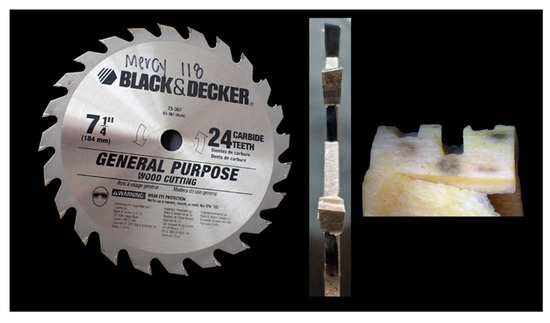 In our study, if excluding the circular saws, 100% of W-shaped kerfs were made by saws with crosscut, alternating teeth. The one circular saw that created W-shaped kerfs had teeth with a flat forward cutting surface and therefore was classified as a “rip” saw in this research. However, the tops of the teeth exhibit an alternating bevel, referred to as “alternate top bevel” (https://circularsawblade.net/atb, accessed 18 September 2025 [28]) (Figure 6). This characteristic explains why the kerf profile created by this type of saw would be W-shaped. In fact, this alternate top bevel is described as a feature imparted to ease cutting across the grain of wood, as crosscut saws are designed to do [26]. Symes et al. [18] similarly noted that some circular saws may produce W-shaped kerfs, presumably because of such alternating top bevel teeth. Future studies should likely categorize these saws along with crosscut alternating blades.