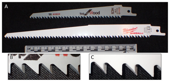 Crosscut blades that appear to have been misidentified as rip saws in Bernardi et al. [24] (A—top: gray Bosch blade) and Berger et al. [4] (A—bottom: white Milwaukee blade). (B) Close-up of teeth in the Bosch blade used by Bernardi et al. [24]. (C) Close-up of teeth in the Milwaukee blade used by Berger et al. [4]. Note the beveled edges visible on every other tooth.