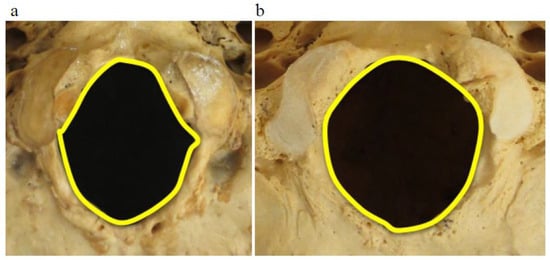 28. Catalina-Herrera, C.J. Study of the anatomic metric values of the foramen magnum and its relation to sex. Acta Anat. 1987, 130, 344–347. [Google Scholar] [CrossRef] [PubMed]