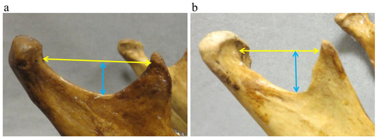 Figure 3. Sigmoid notch morphological traits were recorded as shallow ((a), blue arrow) or deep ((b), blue arrow) as well as wide ((a), yellow arrow) or narrow ((b), yellow arrow).