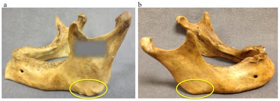 Figure 4. Gonial angle (indicated with the yellow circles): marked muscle attachment (a) and slightly marked muscle attachment at the gonial angle (b).