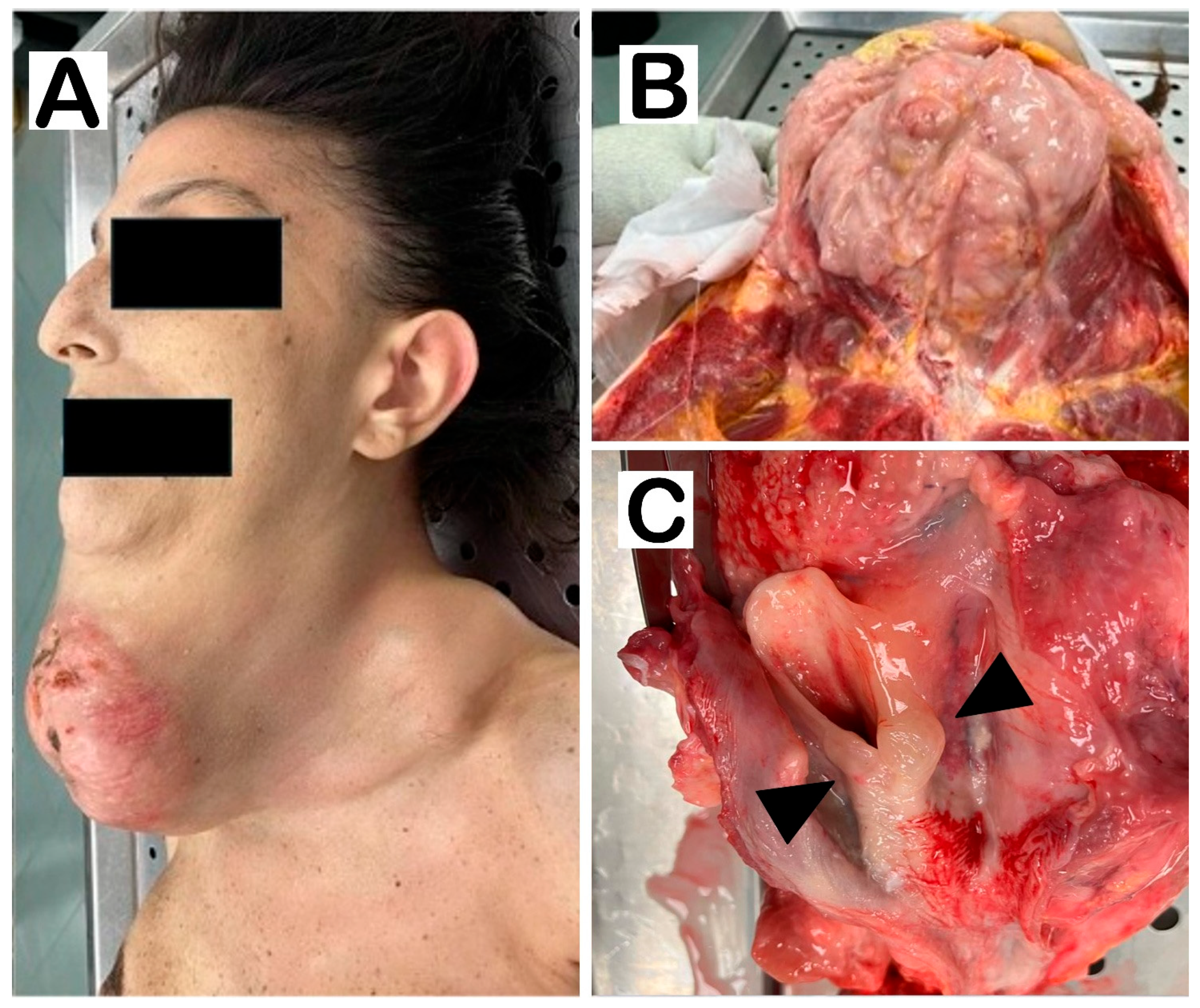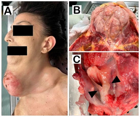 (A). External examination of the neck, lateral view. Note skin distension with ulcerations. (B). Dissection of the neck shows a large grayish-white mass. (C). At the opening of the esophagus, the neck organs appear compressed, with slight displacement of the trachea. Note how the upper edge of the laryngeal cavity is edematous with irregularities in the closing edge of the epiglottis (arrowheads). No thyroid portions are observed.