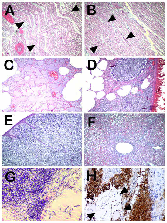 (A,B). Heart—left (A) and right ventricle (B). Area of myocardial fiber undulation indicating recent cardiac ischemia (arrowheads). No signs of myocardial inflammation are observed (H&E, 40×). (C). Lung—edematous fluid in the alveoli (H&E, 40×). (D). Lung—Catarrhal bronchitis with initial involvement of the closest alveoli, similar to an incipient bronchopneumonic focus. The presence of polymorphonuclear cells suggests a bacterial rather than viral etiology. No signs of ARDS are observed (H&E, 40×). (E). Skin—the skin overlying the neck mass is distended and thinned, massively infiltrated by neoplastic lymphoid elements (H&E, 40×). (F). Liver—the structure is preserved. Moderate steatosis with large hepatocyte liver droplets is observed (H&E, 40×). (G). Cervical mass—a compact proliferation of moderately differentiated, relatively monomorphic lymphoid elements is observed. The neoplasm infiltrates the thyroid tissue, which appears atrophic with follicles containing a small amount of cracked colloid fluid (bottom right) (H&E, 40×). (H). On immunohistochemistry, the lymphoid neoplastic population was uniformly and strongly positive for CD20 and CD10 (data shown in the Supplementary Materials). The infiltrated thyroid tissue is negative (arrowheads). The IHC results indicate the diagnosis of germinal center-related diffuse large B-cell lymphoma.