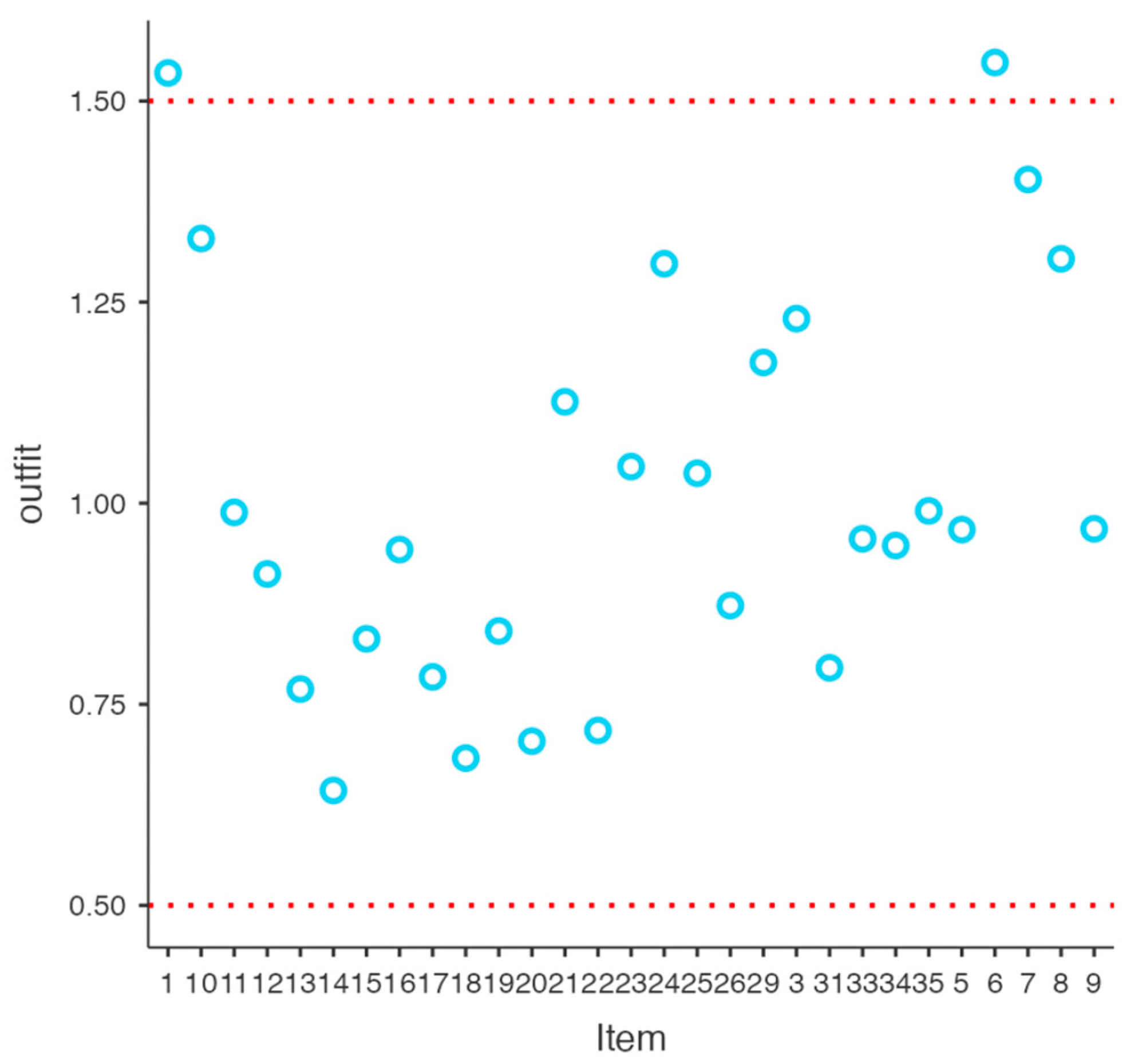 - Wright, B.D.; Linacre, J.M. Reasonable Mean-Square Fit Values. Rasch Meas. Trans. 1994, 8, 370. [Google Scholar]